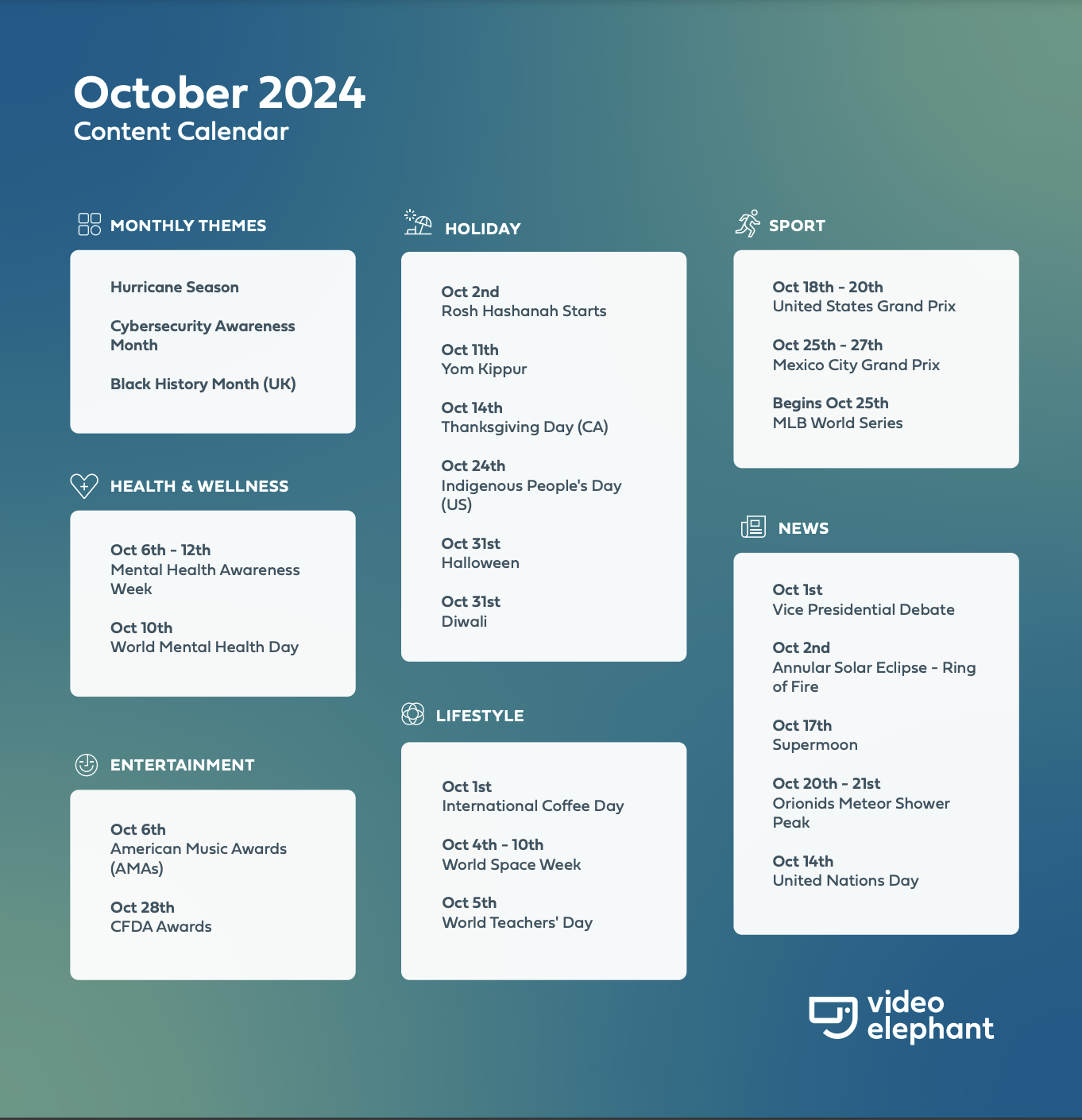 Each quarter, we’ll release a new calendar that includes suggested video content for major events. For Q4, October’s videos are already available via the links provided. As for November and December, keep an eye out for the video assets, which will be delivered just before each new month.
